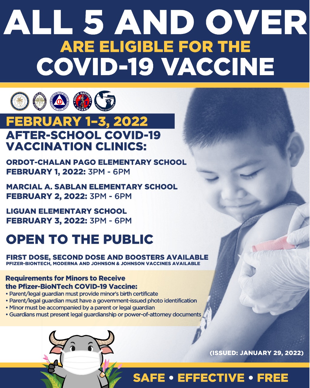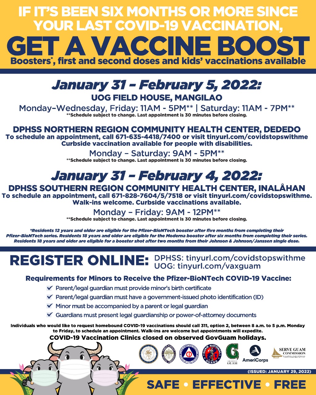Agat Gym, Hagat Walk-ins are welcome, but appointments will be expedited. Please bring appointment confirmation and proof of identity. Minors must have a birth certificate, parents must have a government-issued photo ID. Last appointment is 30 minutes before closing. Register at tinyurl.com/covidstopswithme |